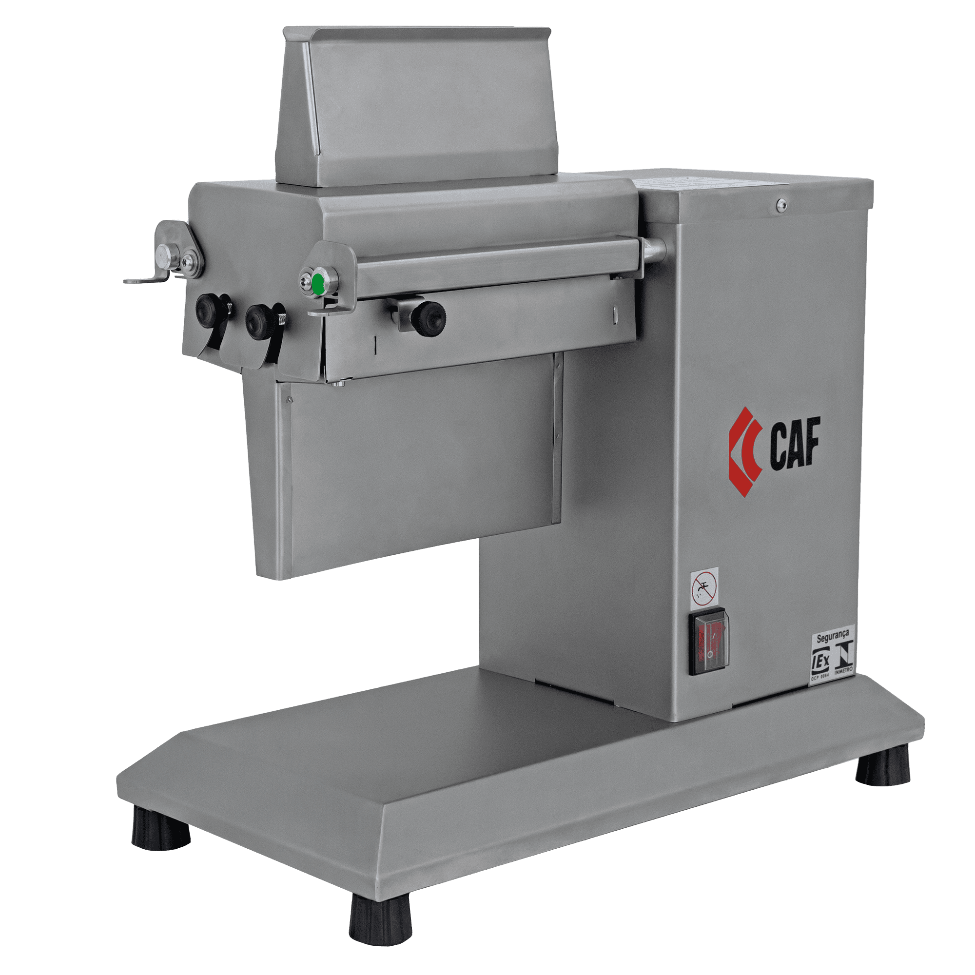 O Amaciador de Carne CAF AMB SM-Bivolt é um equipamento indicado para uso em: açougues, cozinhas industriais e supermercados. O gabinete monobloco é constituído em aço inox. Sua capa protetora é de aço inox e manca em polipropileno. Pentes em aço inox e rolos em aço inox com eixo sextavado, facilitando a montagem e desmontagem. O modelo AMB SM possui um sistema de segurança mecânico que impede o acesso dos membros superiores nos rolos ao ligar o equipamento.