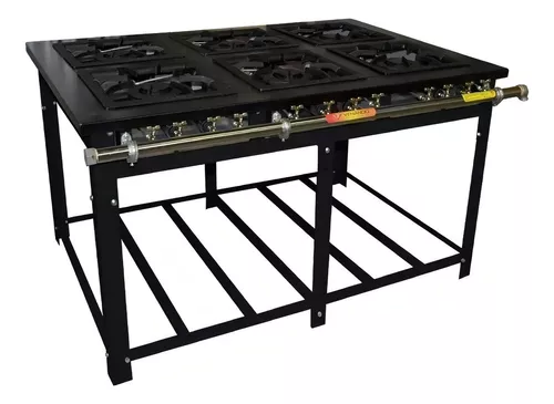 O Fogão Maxi 6 Bocas Duplas possui corpo e mesa de aço carbono super resistente em pintura pó eletrostática com base fosfatizada, tubo distribuidor de 1" com acabamento cromado, tampão e entrada de gás reversível e grelha reforçada 40x40cm em ferro fundido.